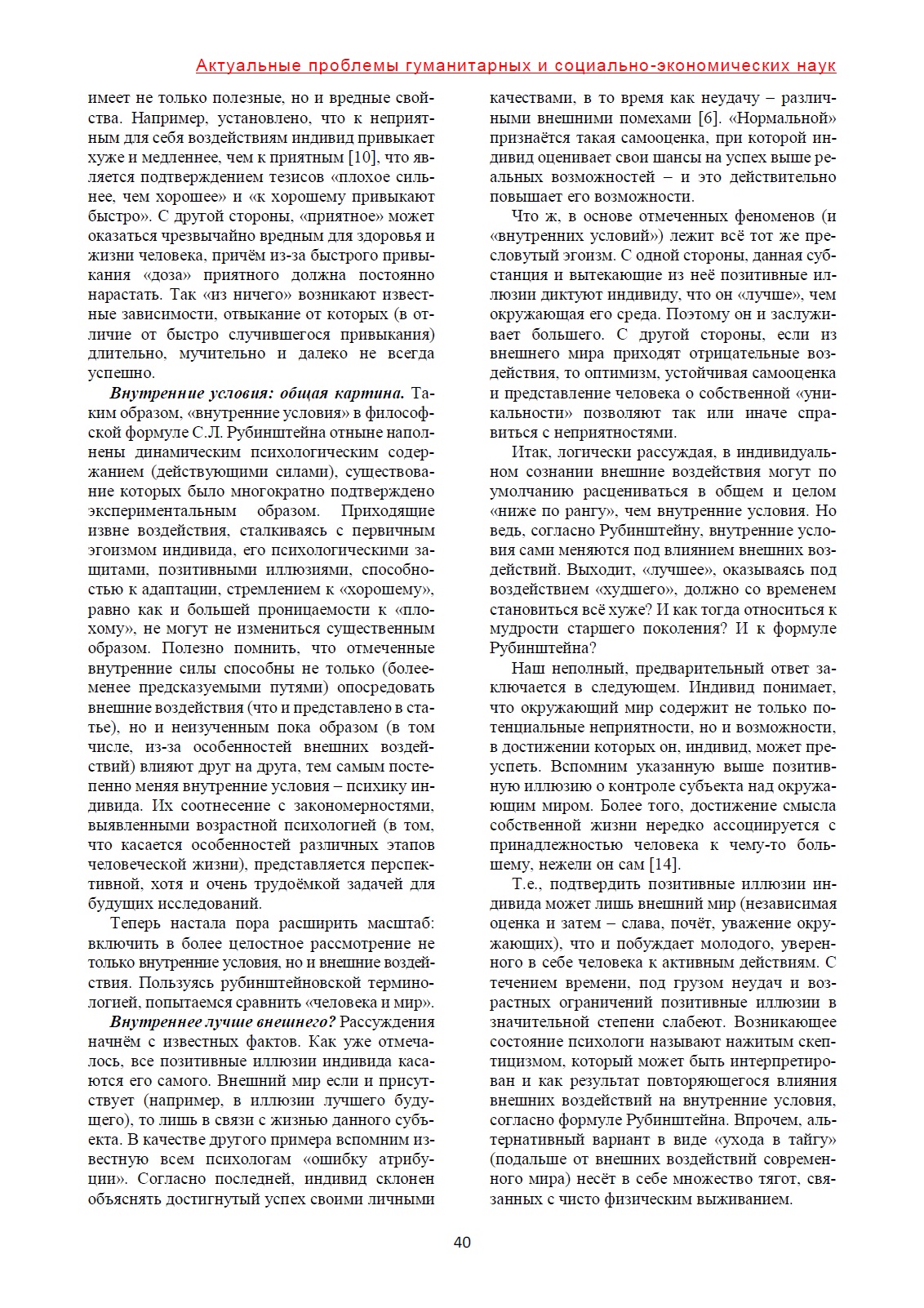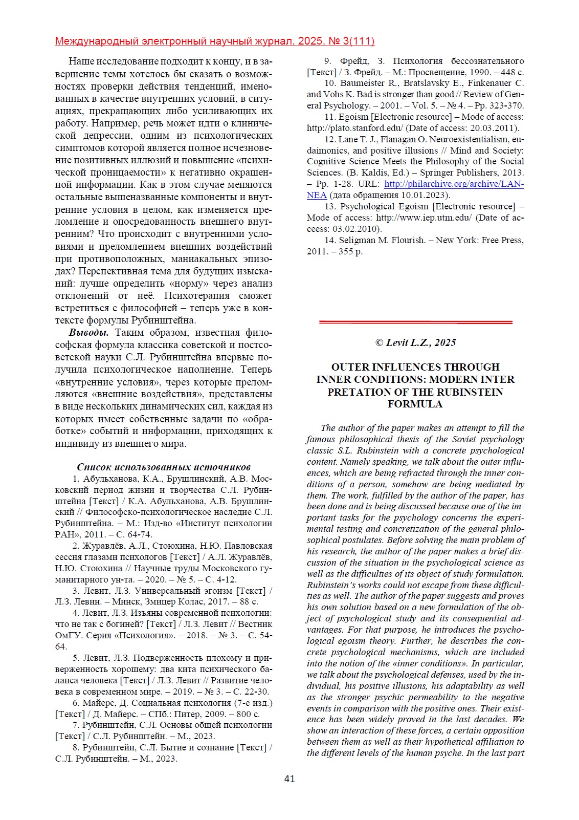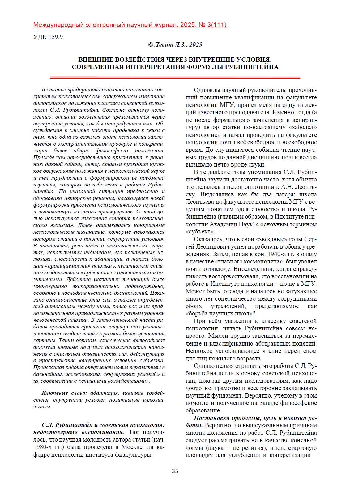 Левит Л.З. Внешние воздействия через внутренние условия: современная интерпретация формулы Рубинштейна // Актуальные проблемы гуманитарных и социально-экономических наук. – № 3 (111). – Вольск: изд-во ВВИМО, 2025. – С. 35-42.
